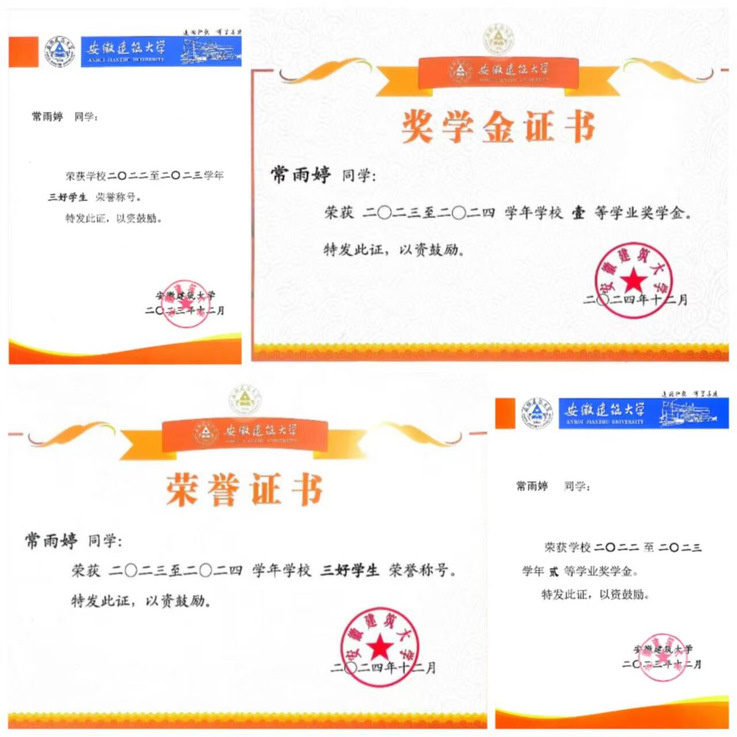 常雨婷,安徽建筑大学电子与信息工程学院2022级建筑电气与智能化专业本科生,现任班级副班长和辅导员助理。自入学以来,她始终保持着优异的学习成绩,平均绩点3.76,位列专业第二。曾获国家励志奖学金、校一等奖学金、校“三好学生”、校“优秀团员”等荣誉。积极参与学科竞赛与创新创业项目,获“双百”大赛三等奖、大创项目省级合格结题等多项奖励。目前,已成功保研至长安大学电气工程专业。
