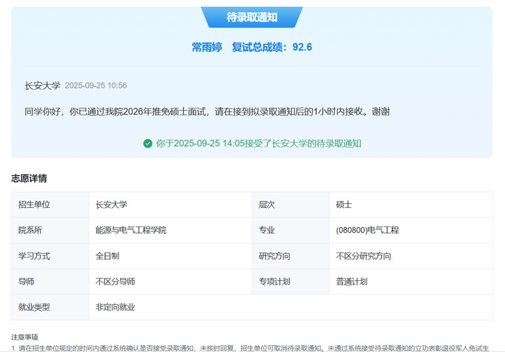 获得推免资格后,常雨婷结合自身对电气工程及智能化领域的持续兴趣,综合考虑学科实力、科研平台及城市发展等因素,最终选择长安大学作为继续深造的平台。她认为,保研既是过去努力的见证,更是新征程的起点。她期待在研究生阶段进一步夯实专业基础,投身科学研究,将个人发展融入国家建设需要,在智能电气领域不断探索,实现自己的人生价值与理想追求。