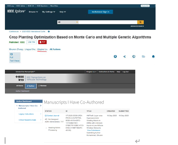 刘明恺聚焦深度学习安全方向展开系统性探索。作为第一学生作者,他围绕低空无线网络场景下的DNN超参数窃取问题深入研究,重点解决未知输入尺寸条件下模型窃取泛化能力不足的核心难题。研究过程中,构建多任务超参数窃取框架,结合超球面特征映射与损失函数优化设计,着力提升模型在小样本、单域条件下的泛化能力,相关成果目前已投稿至IEEE TVT期刊。