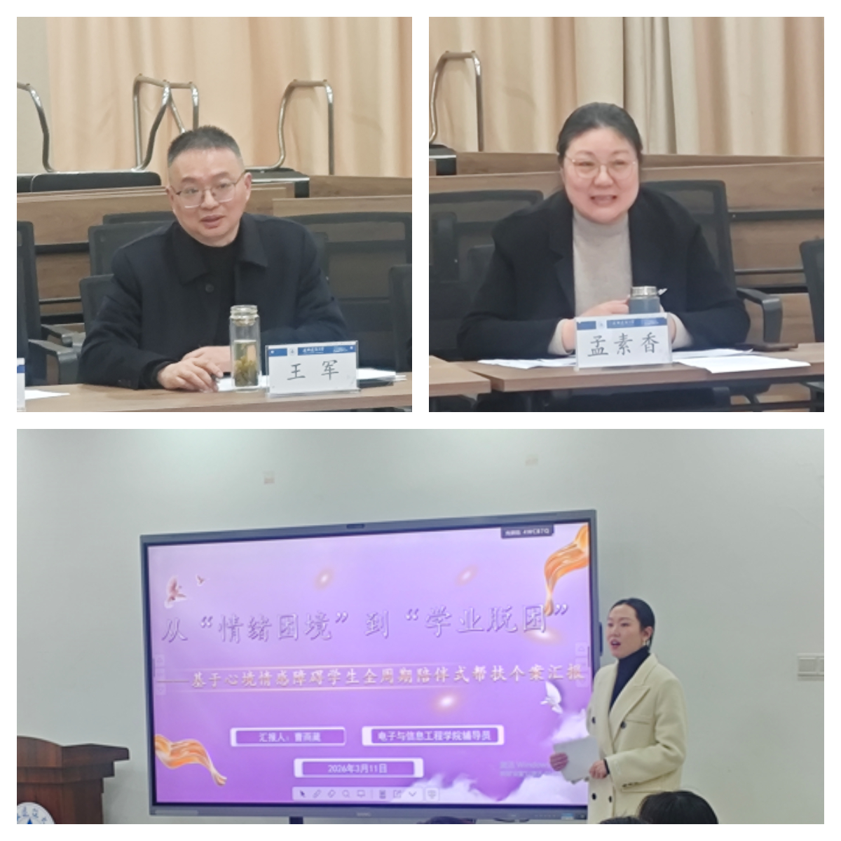 本次研讨的学生心理案例来自电信学院副站长曹雨葳。她系统呈报了对一名存在严重心理困扰学生长达七个月的陪伴式帮扶过程,重点介绍了通过建立深度信任关系,构建覆盖心理、学业、安全及家校协同的全方位支持体系,最终帮助学生逐步回归良好状态的核心做法与反思。