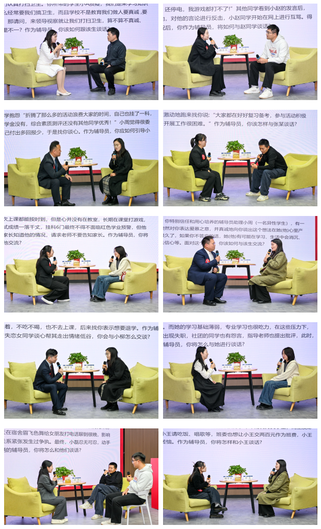 经过初赛、复赛的激烈角逐,共有10位辅导员脱颖而出进入本次决赛。决赛采用谈心谈话的方式,系统考察辅导员政治素养、理论水平、沟通技巧、问题处置及育人实践等综合能力。