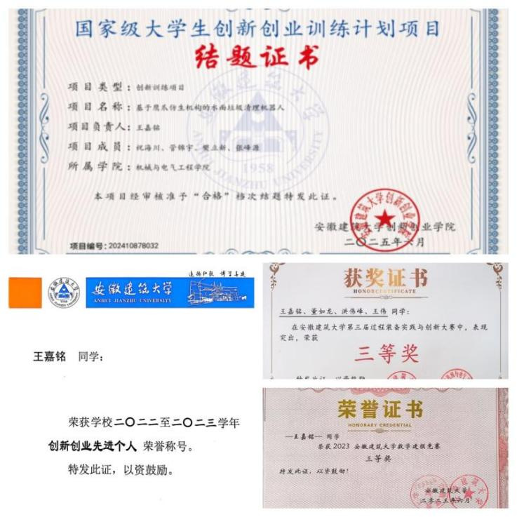 凭借扎实的专业基础与创新思维,王嘉铭主持一项国家级大学生创新创业训练计划项目,集中仿生机器人领域的应用研究方向。项目推进期间,他系统钻研MATLAB/Sim