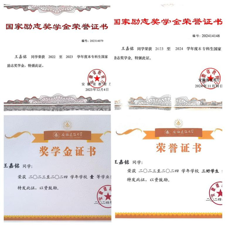 王嘉铭,安徽建筑大学机械与电气工程学院2022级过程装备与控制工程专业本科生,中共党员。曾荣获国家励志奖学金、校一等奖学金等。自大一以来,成绩一直保持优异,平均绩点3.84,位居专业第一,多门课程取得90+的优异成绩,现成功保研至华东理工大学动力工程及热物理专业。