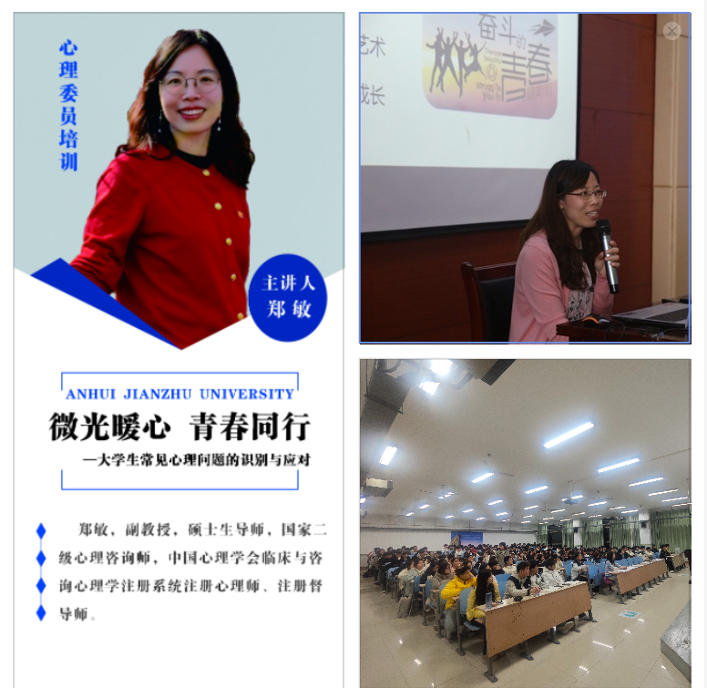为提高培训专业性,本次活动特邀公共管理学院郑敏副教授作专题讲座。郑敏老师是中国心理学会临床与咨询心理学注册系统的注册心理师和注册督导师,兼具扎实的理论素养与丰富的实战经验。她围绕“大学生常见心理问题的识别与应对”这一核心,通过生动的案例、互动问答等形式,深入浅出地讲解了大学生群体中常见的心理困扰表现、科学的识别方法以及有效的朋辈沟通与支持技巧。郑老师强调,每一位心理委员的用心关注和及时反馈都可能成为照亮同学心灵的“微光”,鼓励大家用科学的知识和温暖的共情履行好“青春同行者”的使命。