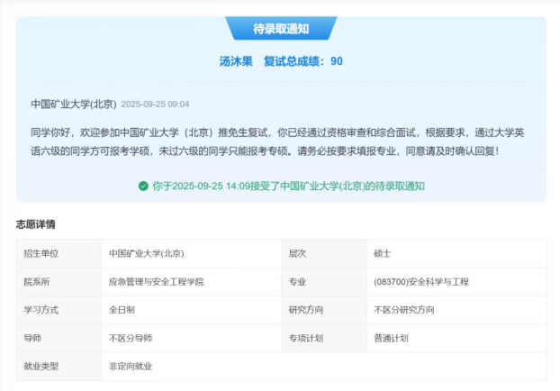 日月不负赶路人,时光不负有心人。汤沐果用三年的坚持与沉淀,书写了属于自己的保研答卷。这位心怀热爱、肩担责任的消防工程学子,必将在未来的学术与实践之路上,绽放更耀眼的光芒。(文/图:蒋瑾 、汤沐果;一审:王昊禾、方绍正;二审:帅英;三审:戴前宏、徐庆和)