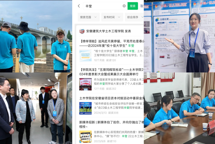 乐于奉献,热心公益:丰莹同学为班级宣传委员、学生会部长以及协会部长,通过创意策划与高效执行,显著提升了校园活动的知名度与参与度,促进了学生组织间的协作与成长,为校园生活注入了活力与凝聚力。同时,积极参与各类志愿者活动,如科技馆志愿者、宣传肺结核、辅导留守儿童学习等,以实际行动传递爱心与正能量。在暑期“三下乡”社会实践活动中,作为乡村桥梁安全风险以及防灾设施调研团队的副队长,带领团队共赴徽州开展相关调研,用青春奉献社会,展现了新时代大学生的使命担当。