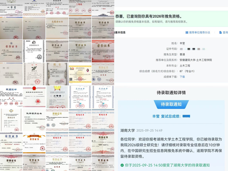 志存高远,砥砺前行:丰莹凭借扎实的专业基础与全面的综合素质,成功获得保研资格。在她看来,保研不仅是对过往努力的认可,更是开启下一段学术旅程的关键选择。在广泛调研与审慎思考后,她结合自身对结构工程与桥梁安全研究的持续兴趣、目标院校的学科实力与科研平台、导师的研究方向与培养模式,以及城市学术氛围与发展潜力等多方面因素,最终选择湖南大学作为自己未来深耕专业、追逐理想的全新平台。她相信,在这片历史悠久、工科底蕴深厚的学术沃土上,自己将能更好地融合理论与实践,在科研道路上走得更稳、更远。