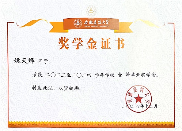 姚天烨,中共党员,安徽建筑大学土木工程学院2022级城市地下空间工程专业本科生,曾荣获校学业一等、二等奖学金、合轨优才二等奖学金,三好学生、优秀共青团员等荣誉称号。自大一以来,成绩一直保持优异,平均绩点3.58,位居专业第二。现已成功保研至合肥工业大学土木工程学院力学专业。