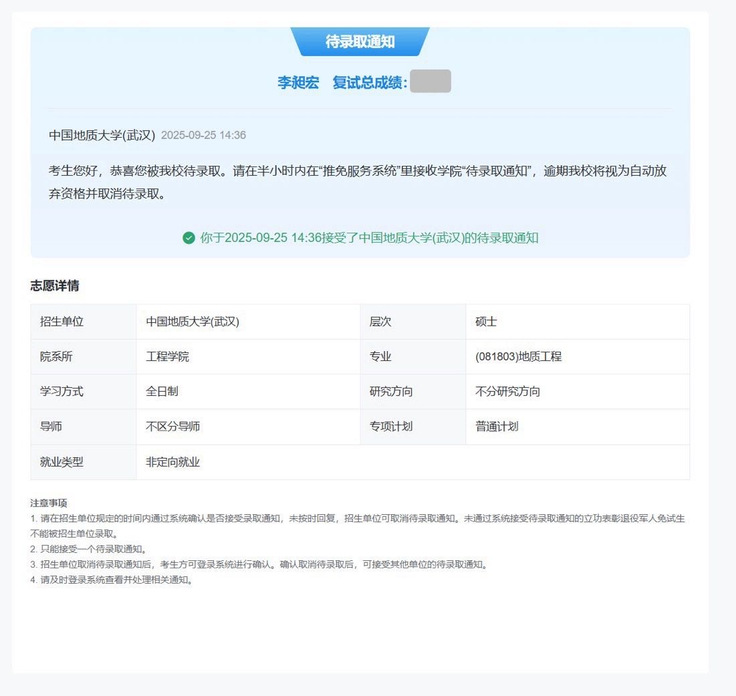 时光如白驹过隙,在安徽建筑大学的求学生涯即将画上句号。当收到中国地质大学(武汉)的拟录取通知时,李昶宏悬着的心终于落地。从合肥紫云路旁的琅琅书声,到即将奔赴武汉南望山下的地质殿堂,回首这一千多个日夜,他的心中充满了感慨与感激。这不仅是一段关于分数的旅程,更是一个地质工程学子从懵懂到坚定,从书本走向荒野的成长史。