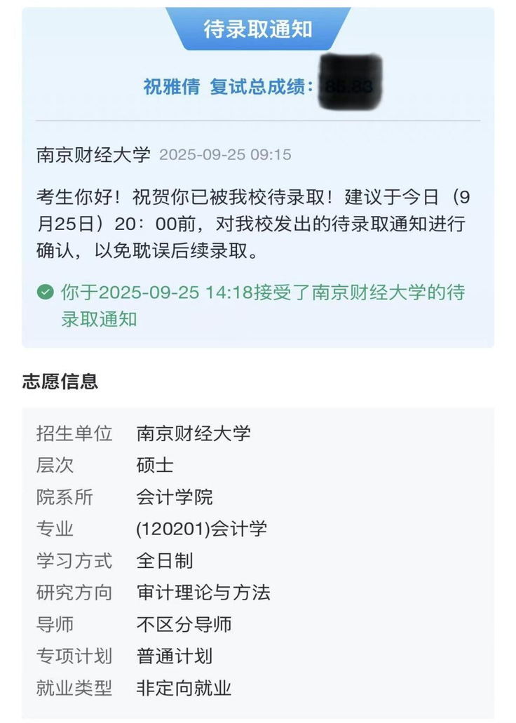 在南京财经大学的面试环节,面试官从专业知识、英语能力、思想政治素养等多个维度对其进行全面考察,其中专业知识板块占比颇高。面对专业领域的提问,她依托扎实的学业积淀,从容不迫地梳理思路,逻辑清晰地阐述个人观点。面试过程中,她聚焦核心优势,充分展现出扎实的学业基础与浓厚的专业热忱。最终,她成功斩获南京财经大学录取通知。这一结果,无疑是对她无数平凡日子里不懈付出的最高认可,也印证了坚持与深耕的价值。