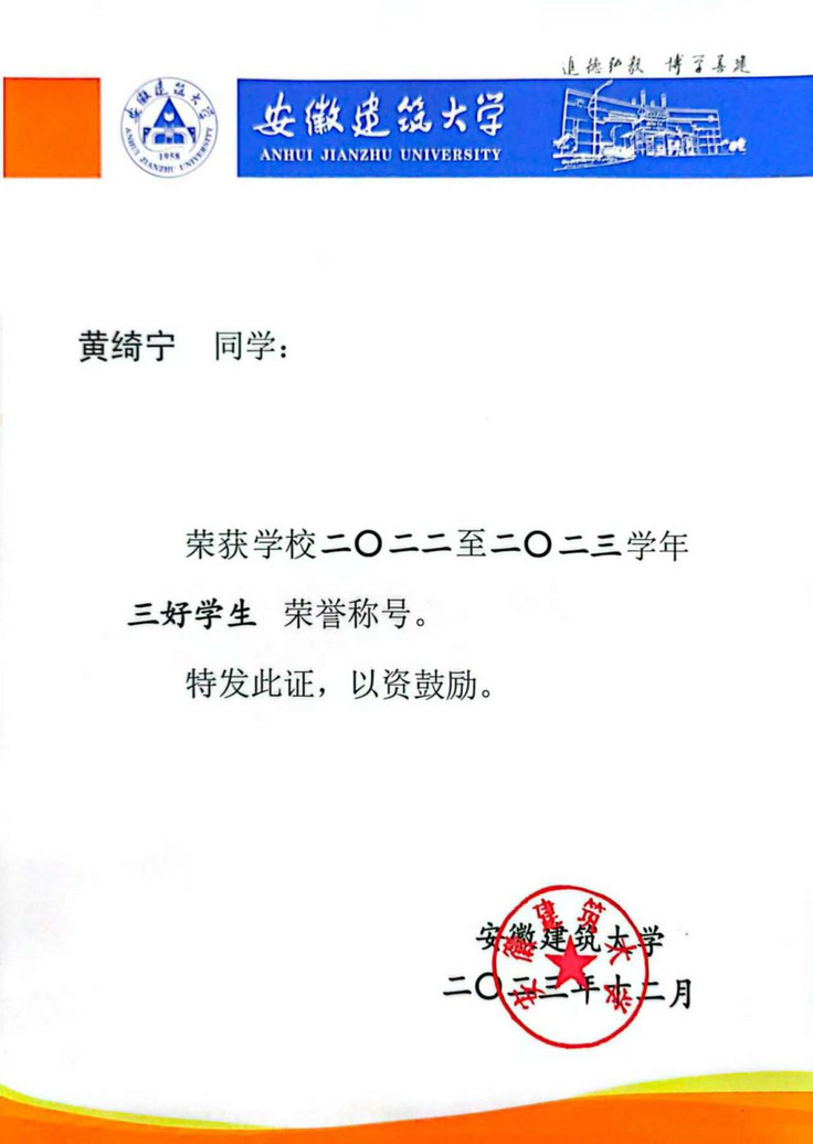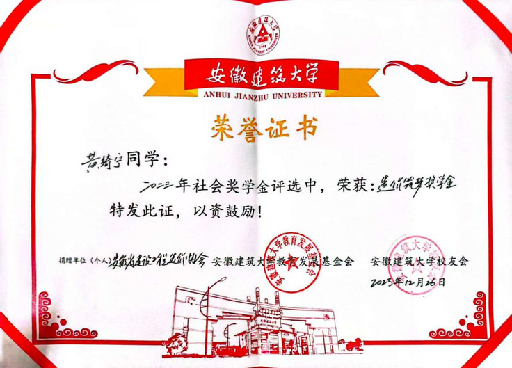 黄绮宁,安徽建筑大学经济与管理学院2022级工程造价专业学生,现已保研至南京林业大学管理科学与工程专业。黄绮宁专业成绩位列专业第一,大一至大三平均绩点达4.15(1/104),多门核心课程成绩优异,《应用统计学》97分、《土木工程施工》98分、《管理运筹学》98分、《高等数学》97分。在校期间,她多次荣获校一等学业奖学金、社会奖学金,并获评校三好学生、校优秀共青团员等荣誉称号。