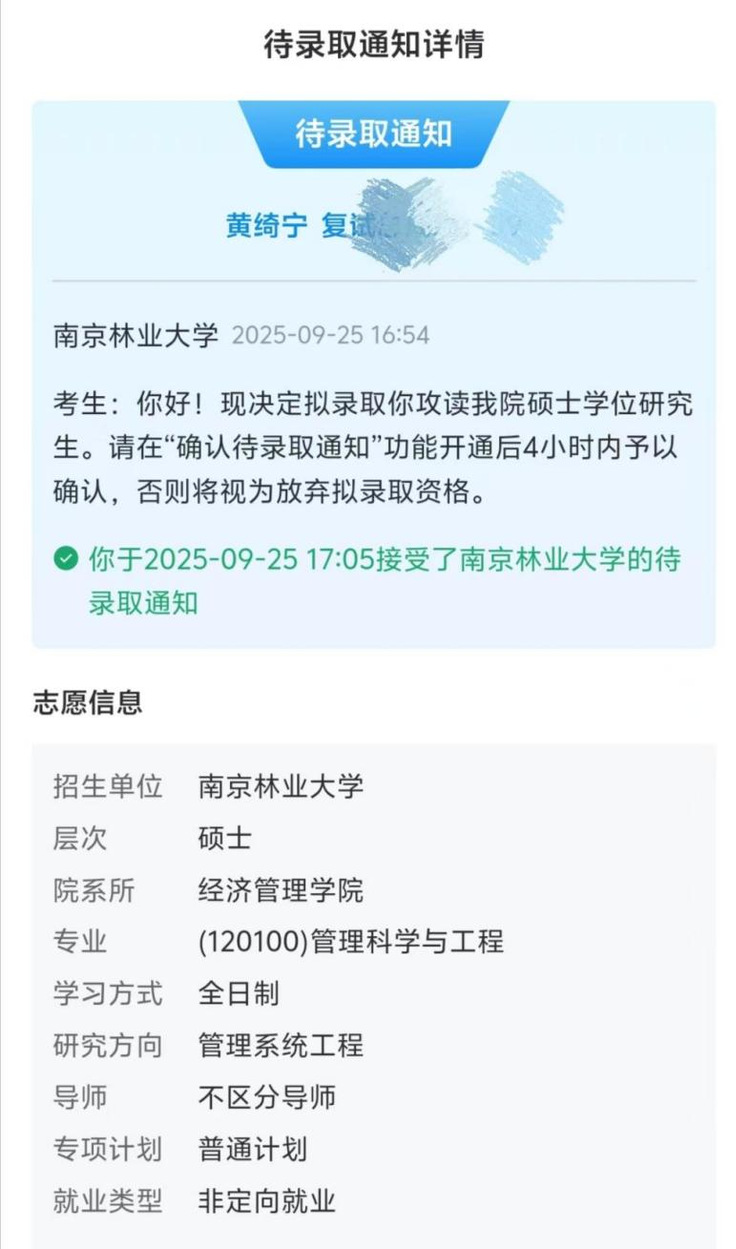 优异的成绩只是保研的基础门槛,科研竞赛经历才是拉开差距的关键。缺乏科研背景的她,在初期的面试中屡屡碰壁,失败后的崩溃、自我怀疑曾反复袭来。但辅导员的悉心开导、同学的暖心鼓励,让她一次次重拾勇气。她将每一次面试的失利都化作宝贵的经验,不断打磨自我介绍、梳理专业知识、优化应答逻辑。在一次次的复盘与调整中,她的表达愈发流畅,专业功底愈发扎实,心态也愈发从容。最终,凭借着扎实的专业积累和愈挫愈勇的坚韧,她成功收到了南京林业大学管理科学与工程专业的录取通知,为这段充满挑战的保研之旅画上了圆满的句号。