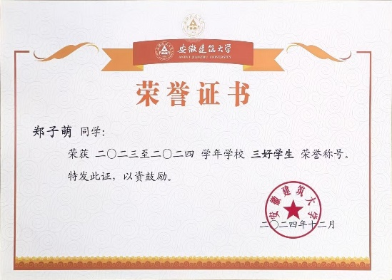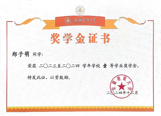 郑子萌,安徽建筑大学经济与管理学院2022级工程管理专业学生,现已保研至南京财经大学管理科学与工程专业。在校期间,她曾获校一等学业奖学金,并获评校三好学生、校优秀共青团员等荣誉称号,前三年平均学分绩点排名专业第一。