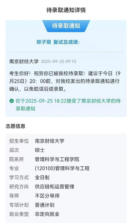 保研不是终点,而是新的起点。“它是对三年坚持与付出的肯定,更是对未来的期许。”郑子萌这样总结自己的保研历程。针对南京财经大学在管理科学与工程等领域的研究特色,她重点梳理了相关领域的核心知识点与最新研究进展,并反复打磨个人陈述、科研报告、推荐信等申请材料。在推免面试中,她凭借扎实的专业功底、努力与从容的表现,给老师们留下深刻的印象。最终,她的坚持与努力得到了回报,成功拿到了南京财经大学的推免资格,圆梦心仪学府。