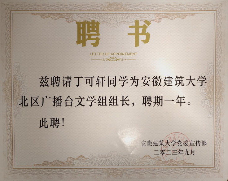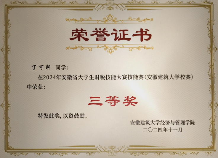 为锤炼专业实践本领,丁可轩同学积极投身各类学科竞赛与校园实践活动。在2024年安徽省大学生财税技能大赛备赛过程中,她系统梳理财税专业知识体系,构建扎实的理论框架,凭借过硬的专业功底与出色的临场发挥,荣获校赛三等奖。同时,她曾担任校广播台播音组长,牵头组建工作团队,统筹推进系列音频节目策划制作,并圆满完成校运会期间的播音主持任务。这些丰富的实践经历,不仅有效检验了其专业知识掌握程度,更显著提升了知识应用能力、组织协调能力与团队协作水平,为个人未来职业发展积淀了宝贵的实践经验与综合素养。