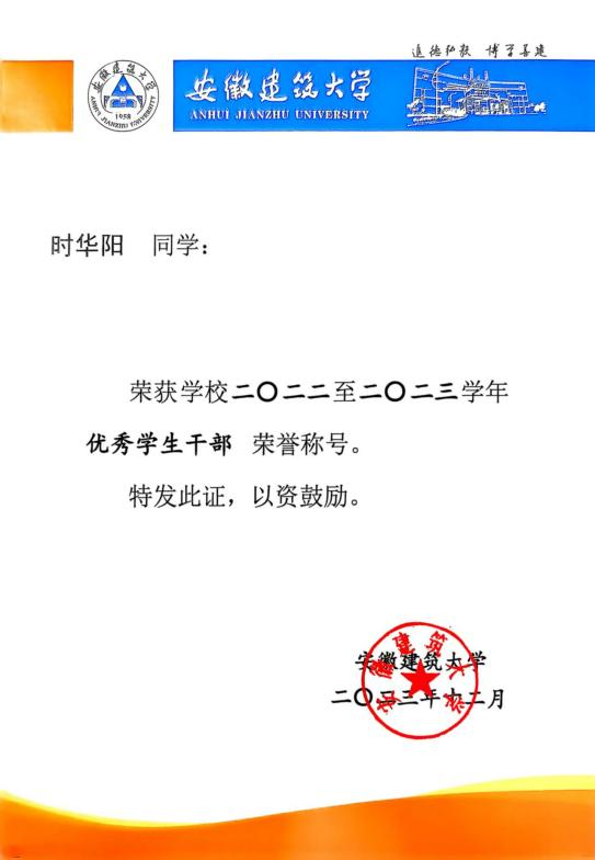 时华阳,中共党员,安徽建筑大学数理学院2022级应用物理学专业本科生。曾荣获国家励志奖学金、联信弘智奖助学金、校二等奖学金等。自大一以来,该同学学习勤奋,一直保持优异的成绩,平均学分绩点4.03。现成功保研至合肥工业大学物理学专业。