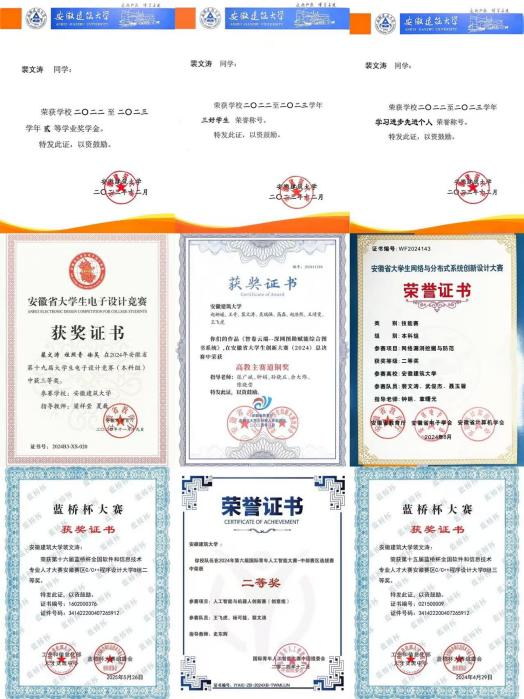 裴文涛,中共党员,安徽建筑大学电子与信息工程学院2022级网络工程专业本科生。自大一以来,成绩始终名列前茅,专业排名稳居前1%,凭借扎实的专业能力与全面的综合素质,成功保研至合肥工业大学计算机与信息学院计算机技术专业。本科期间,他兼顾理论学习、科研创新与工程实践,积极参加各类学科竞赛,累计斩获国家级竞赛奖项2项、省级竞赛奖项12项,以项目负责人身份完成国家级大创项目1项,作为主要完成人参与省级大创项目2项,连续三年荣获“三好学生”“学习先进个人”等荣誉称号,曾获诗城奖学金、校一等奖学金等多项奖励。