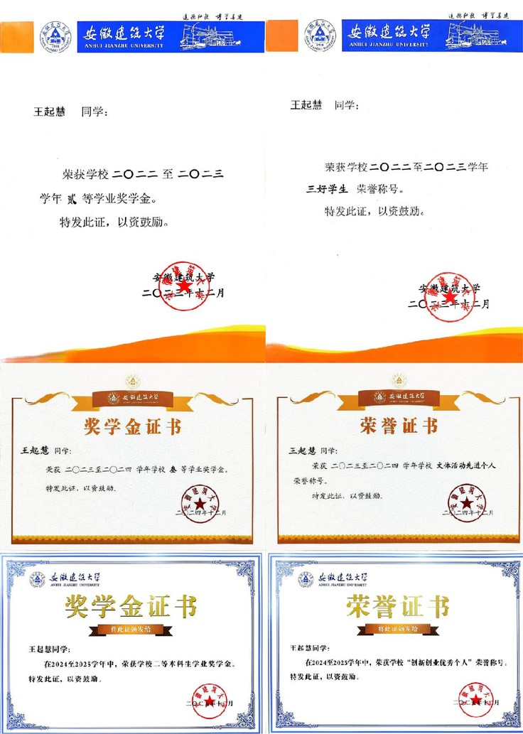 王起慧,中共党员,安徽建筑大学设计创意学院2022级环境设计专业学生。她秉持对专业的热爱与执着,先后荣获校级优秀团员、三好学生、创新创业优秀个人等多项荣誉,手握二等、三等学业奖学金,现已成功保研至安徽建筑大学设计专业。她用点滴行动勾勒出全面发展的成长轨迹,诠释着青年学子的拼搏与担当。