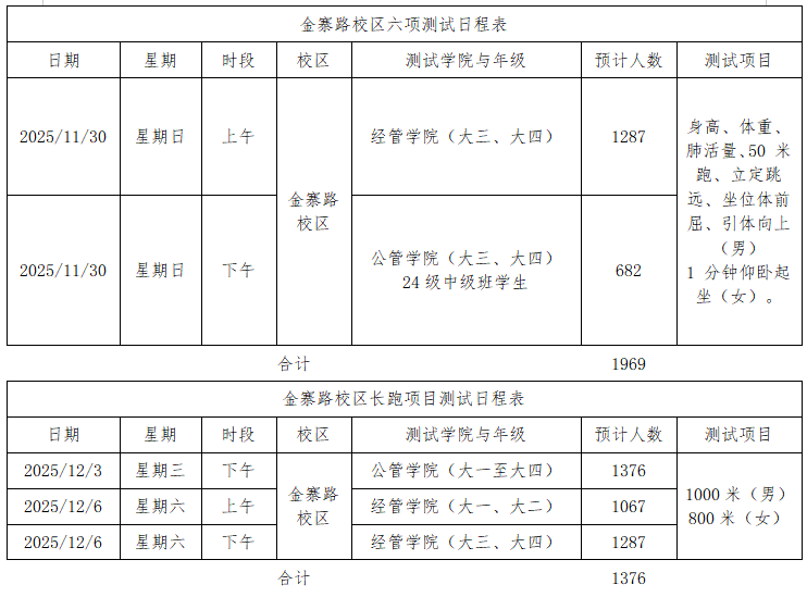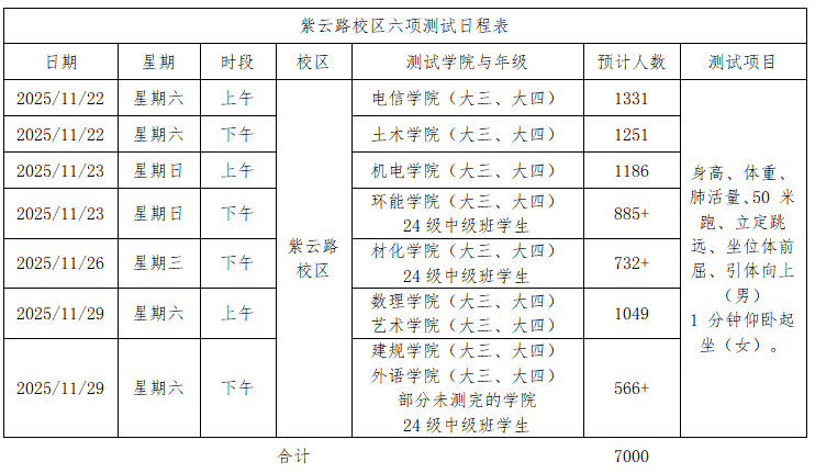 (一)为保障学生测试取得良好成绩,采用长跑和其他六个项目分开测试的方式进行,请各学院务必将两个测试时段通知到位,并安排值班老师到场,督促学生遵守测试秩序并努力测试。