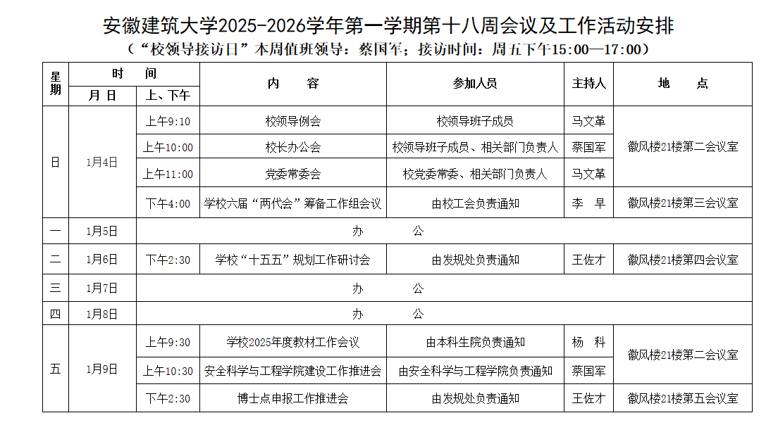 安徽建筑大学2025-2026学年第一学期第十八周会议及工作活动安排
