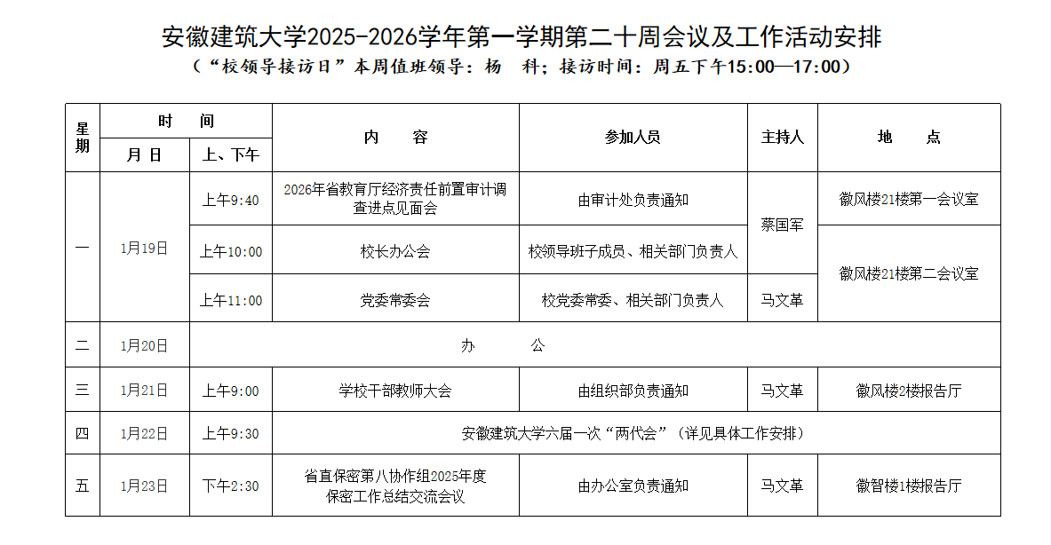 安徽建筑大学2025-2026学年第一学期第二十周会议及工作活动安排