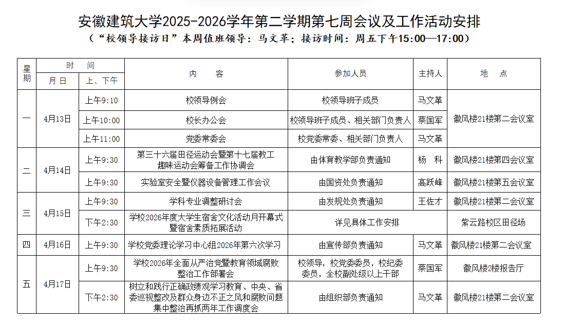 安徽建筑大学2025-2026学年第二学期第七周会议及工作活动安排