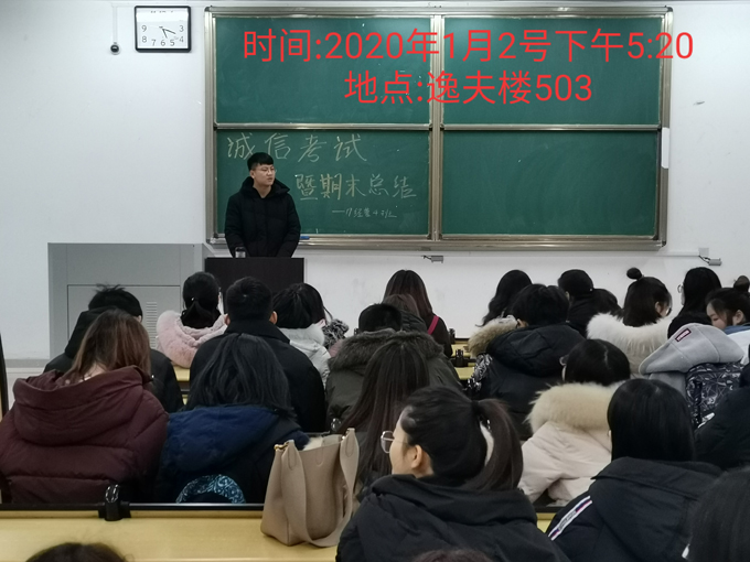 本网讯 为营造以勤奋学习为荣、违纪作弊为耻的良好校风,进一步严肃考风考纪,建立良好的考试秩序,研究生院2019级各班级在期末考试来临之际,组织召开诚信考试主题班会:传达学校考试纪律要求;指导大家认真复习,做好考试准备;加强诚信意识教育,塑造良好道德品质。同学们纷纷签署《学生诚信考试承诺书》,自觉为塑造我院诚信、文明、向上的学风考风而共同努力!(作者:何鹤立;审稿:万德军)