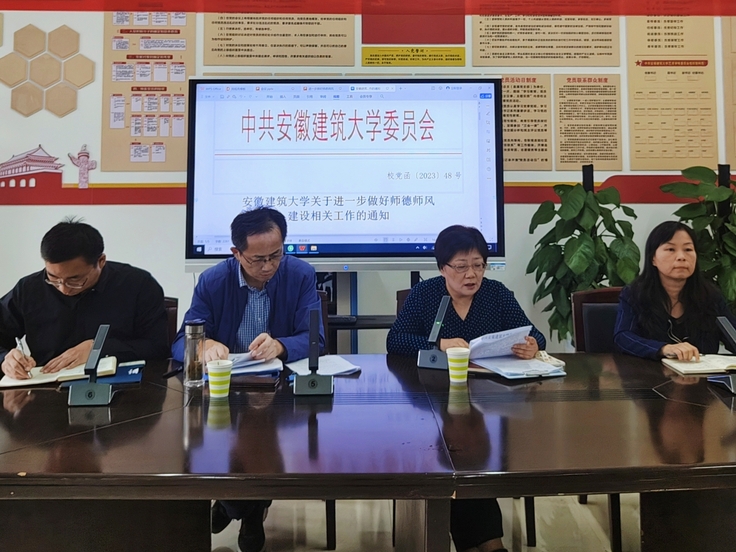 学院副院长(主持工作)邢瑜带领大家学习《安徽省高等学校教师师德失范行为处理办法(试行)》,通报教育部公布的违反新时代教师职业行为十项准则典型案例,提醒各位老师在日常工作生活中要防微杜渐,警钟长鸣,时刻以高标准要求自己。