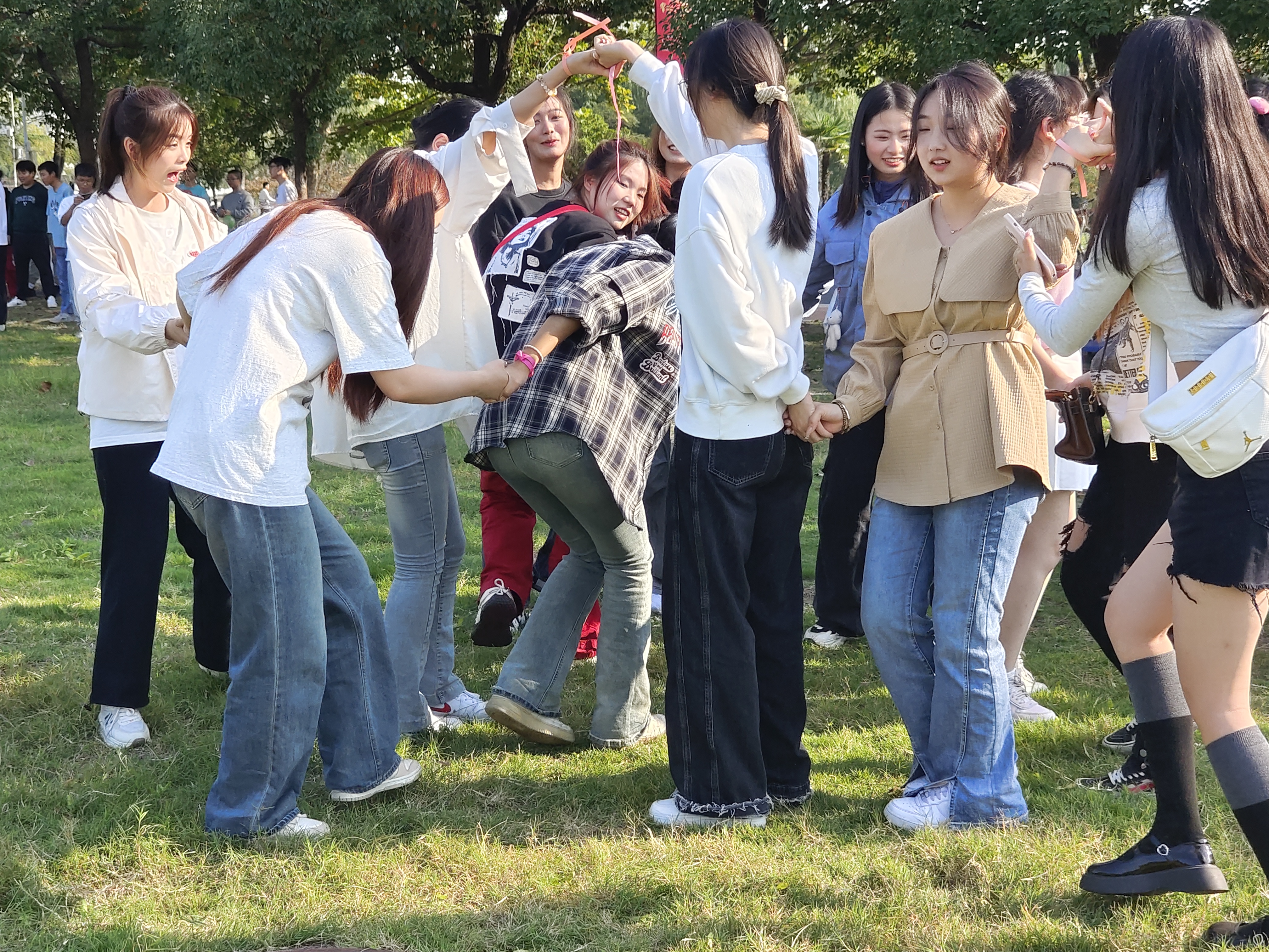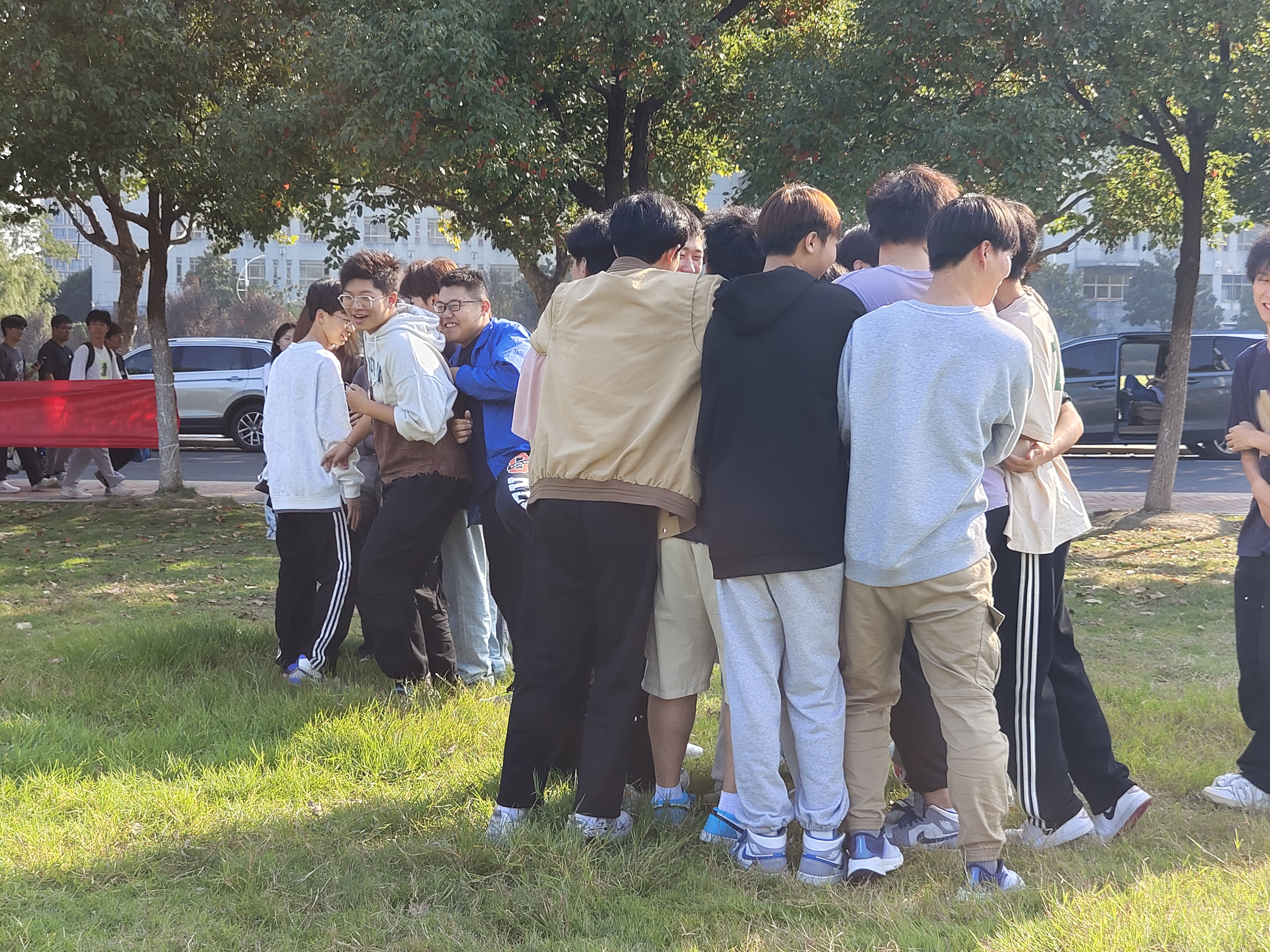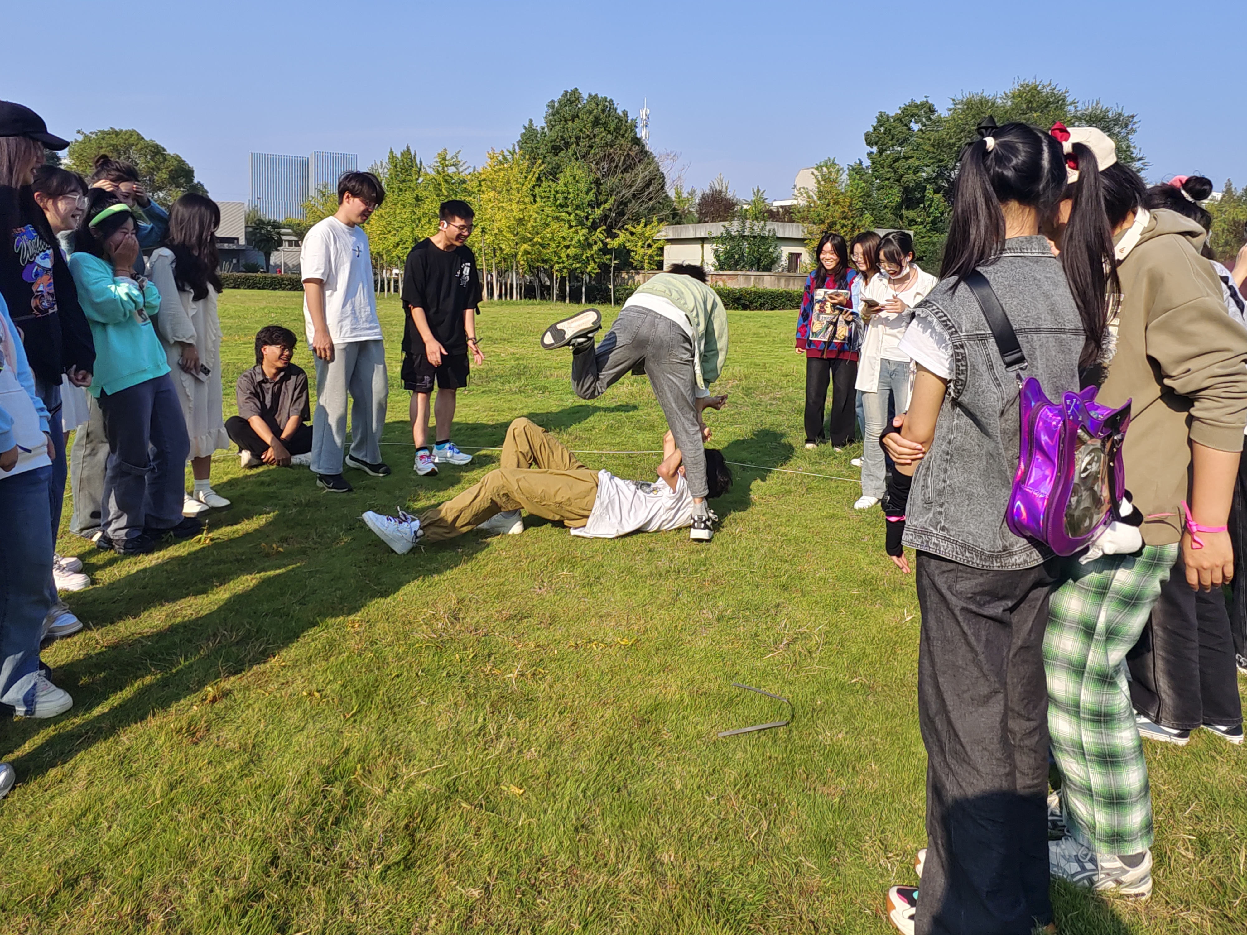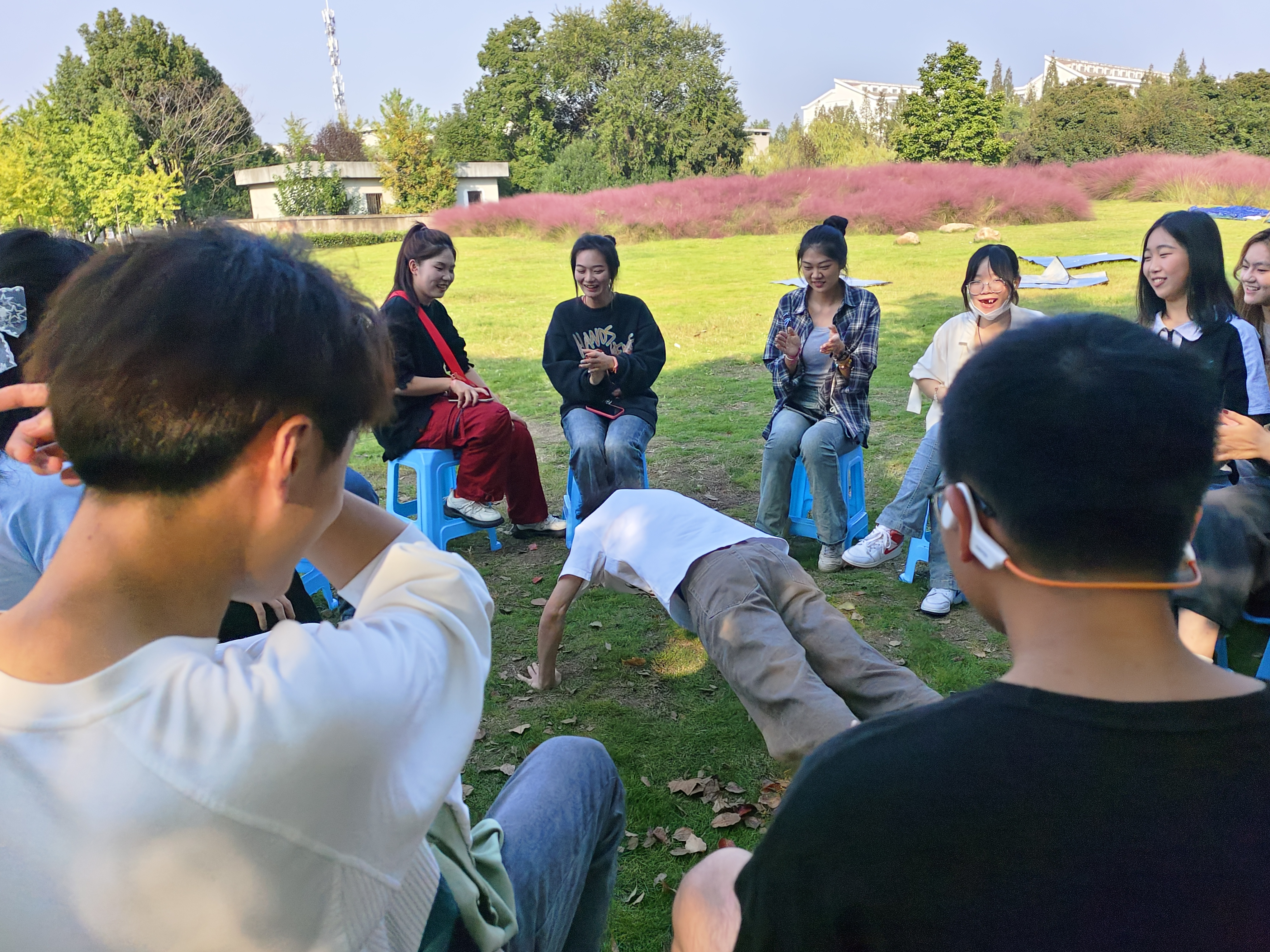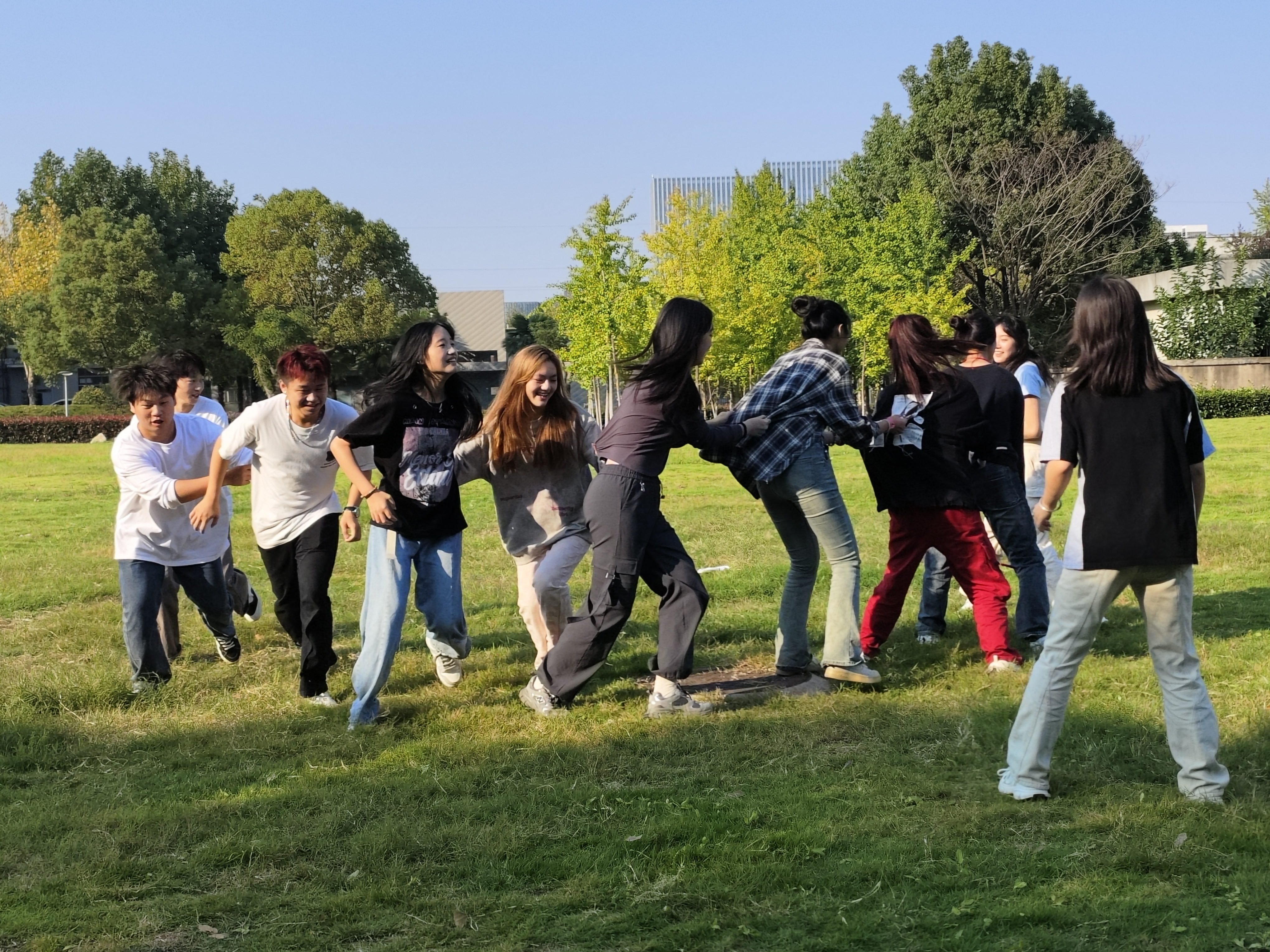 随后,同学们通过自由组队的形式完成了增强信任度的“解手链”游戏、注重团队配合的“五毛一块”游戏、互动性十足的“谁是卧底”游戏、强调归属感的“大风吹”游戏以及增进彼此感情的“击鼓传花”游戏。
