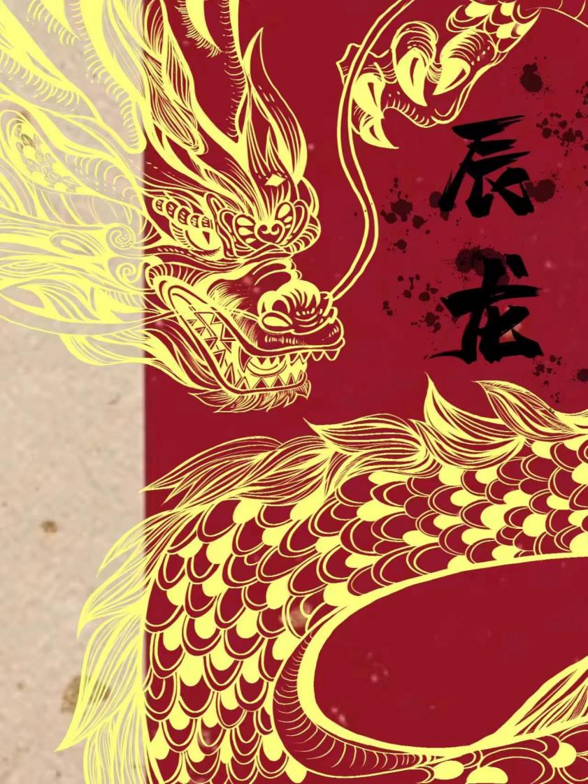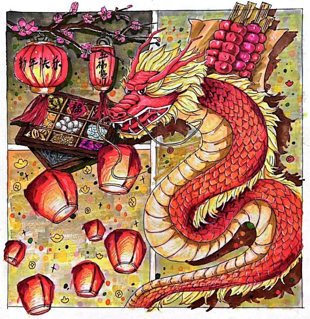 23级环设1班胡莘宇的作品将龙以巧妙的方式融入中国建筑的剪贴艺术中,画面上的巨龙蜿蜒盘旋,气势磅礴,祥云缭绕四周,寓意着吉祥、和平和繁荣。祥云的吉祥如意与龙的硬朗风格形成了鲜明的对比,更加突显了龙的神圣和威严,也展示了中华民族对于龙年盛世的向往和追求。