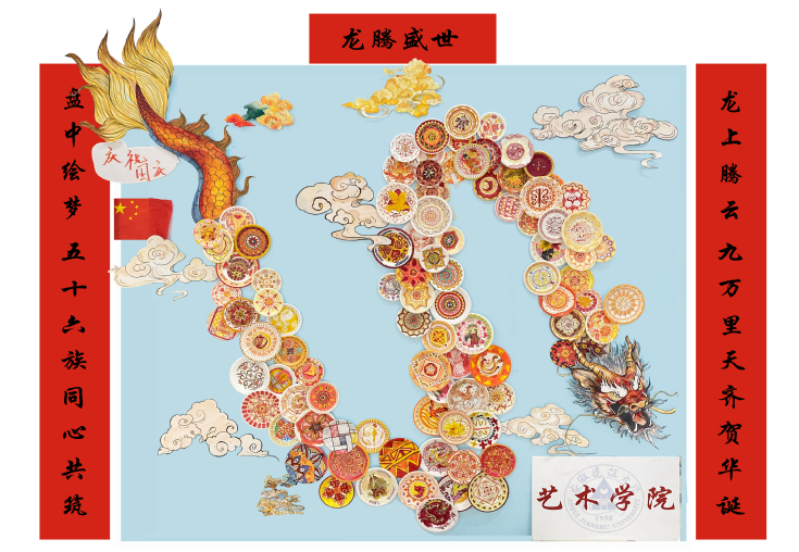 本网讯 金秋十月,为庆祝中华人民共和国75周年华诞,艺术学院百名同学共同创作了汇聚56个民族传统纹样特征的中国龙艺术作品。