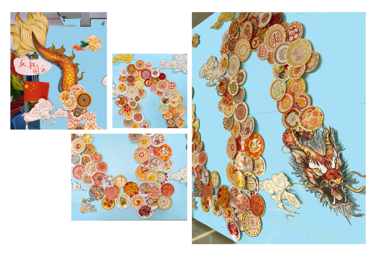 腾飞在天空中、祥云环绕的中国龙由百余个大小不一的盘子组成,每个盘子上绘制了代表中国56个民族特色的纹样,如布依族团花纹、侗族太阳纹、傈僳族几何纹等,象征着中华民族的团结和昌盛。民族纹样作为民族文化的重要组成部分,承载了丰富多彩的民族感情和精神追求。在老师的指导下,同学们认真研究探文化、精心设计展奇思、悉心创作现妙想、携手共抒爱国情,反复的推敲每一个盘子的绘制,力求准确呈现每一个民族的独特文化元素。