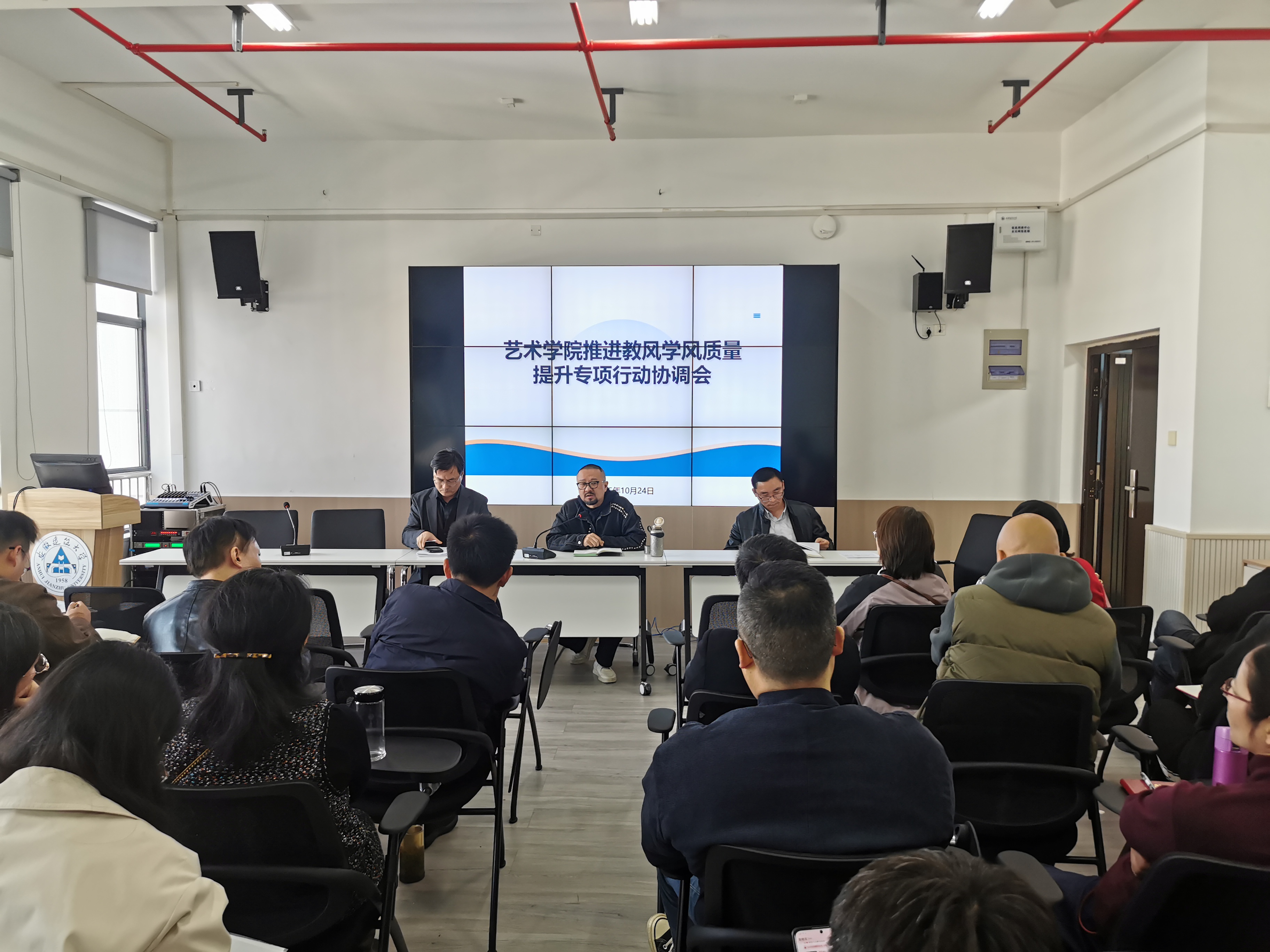 本网讯 1024日,艺术学院在徽韵楼6706会议室组织召开“教风学风质量提升年专项行动协调会”,旨在深入学习贯彻党的二十届四中全会精神,并部署学院教育教学质量提升计划。会议由艺术学院副院长黄成主持,参会人员包括学院领导班子全体成员、全体学业导师及辅导员。此次会议聚焦强化教风学风建设,为学院高质量发展注入动力。