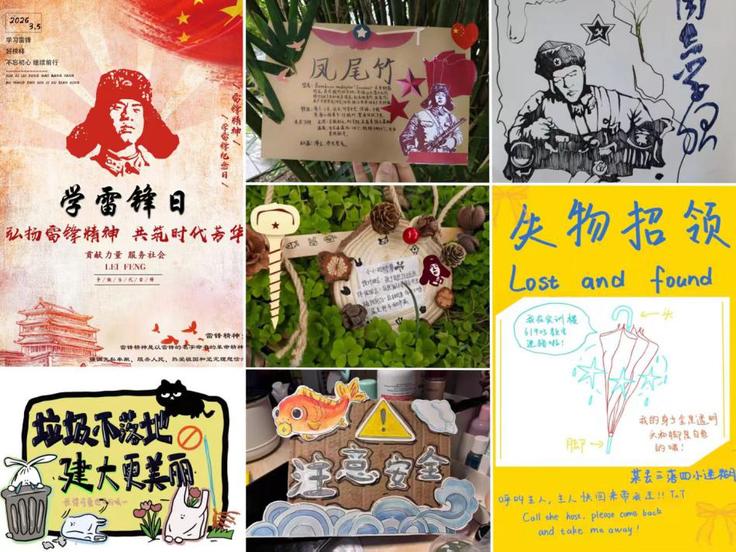 创意赋能,以艺传情。同学们发挥设计专业优势,将雷锋精神融入创作实践:用镜头定格身边好人好事,以影像传递温暖;精心打造雷锋主题IP与表情包,年轻化表达让奉献精神更加鲜活生动;绘制专题海报、为寻物启事等公益信息设计宣传版面,以专业之力服务同学;还为校园微角落创作解说牌,普及植物知识与环保理念。一件件有温度、有创意的作品,既是专业能力的生动展现,更是新时代青年对雷锋精神的青春诠释。