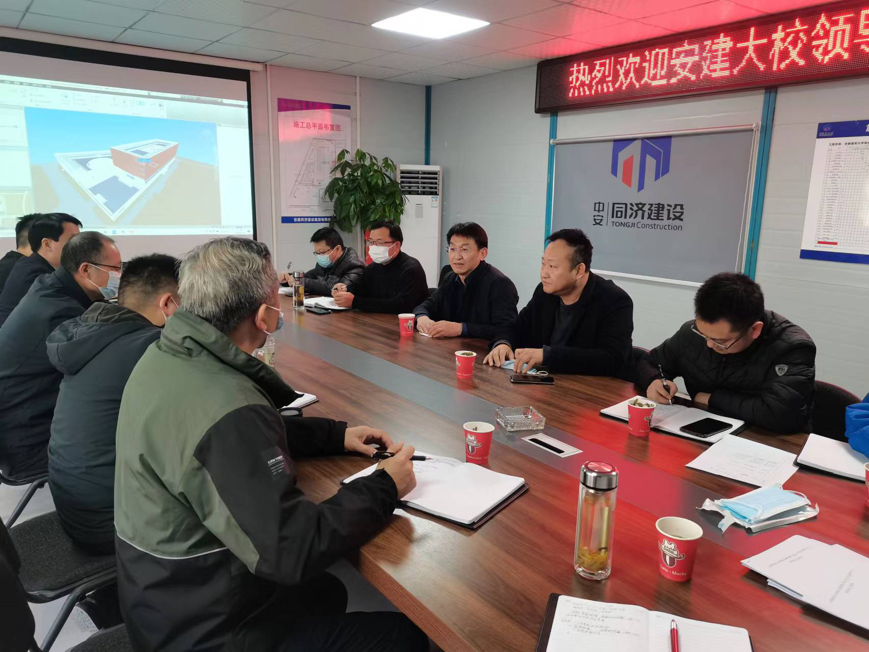 本网讯 12月13日下午,施工总承包单位在南校区教学楼(国土空间大数据中心)项目部会议室组织召开建筑信息模型(BIM)专题汇报会议。校党委常委、副校长张亚新、国资处负责人、施工单位、设计单位、监理单位、项目管理公司代表等相关人员参加会议。