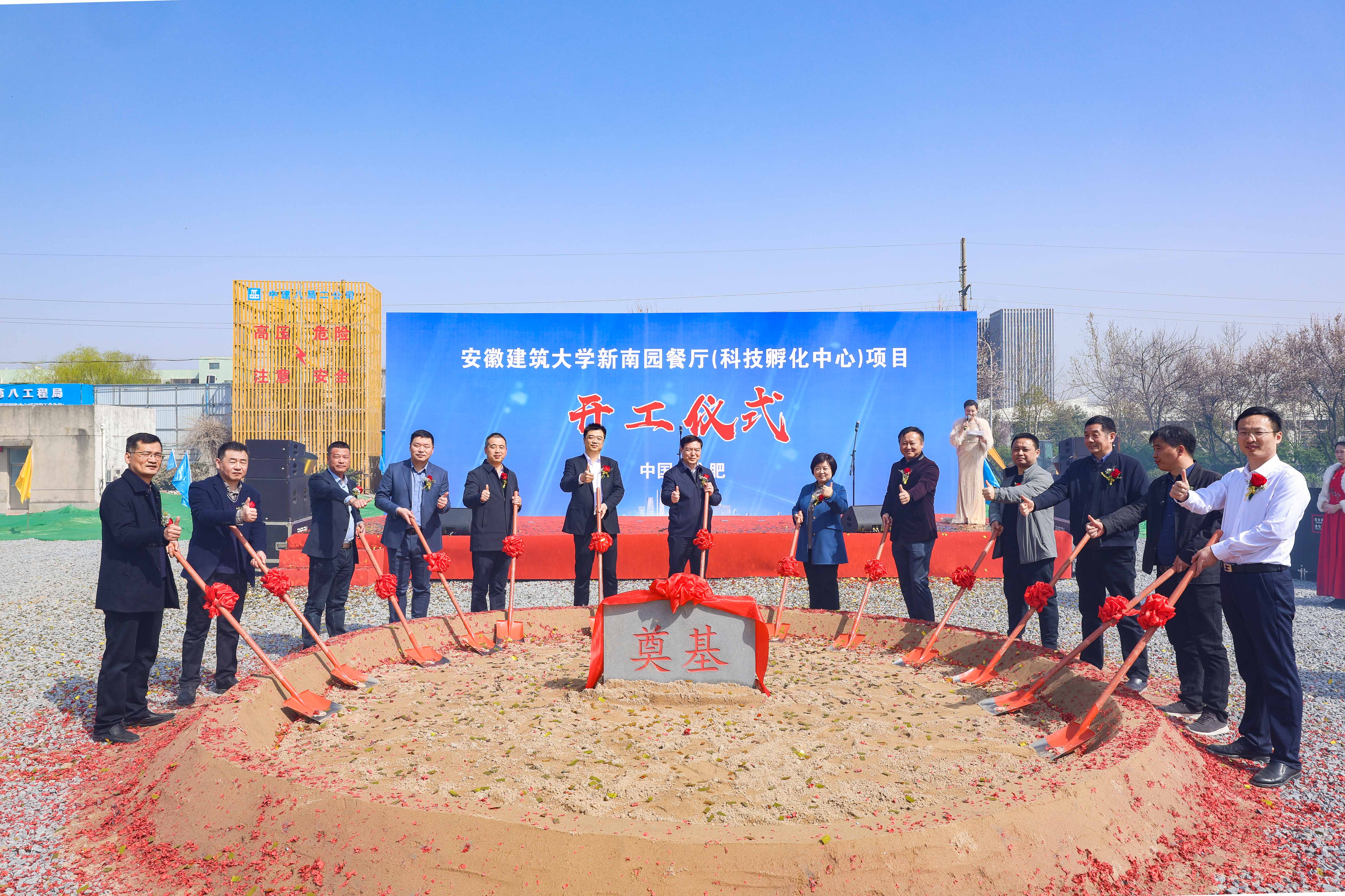 上午10时08分,新南园餐厅(科技孵化中心)开工仪式正式开始,校党委副书记、校长黄显怀,校党委常委、副校长闵杰,校党委常委、副校长李早,中建八局合肥建设有限公司党委书记、董事长丁晓冬,安徽科创工程项目管理有限公司法人代表姚鸿,机械工业第六设计研究院有限公司副院长葛军,校办公室、财务处、国资处(基建办)、信网中心、后勤集团等相关负责人共同出席本次开工仪式。