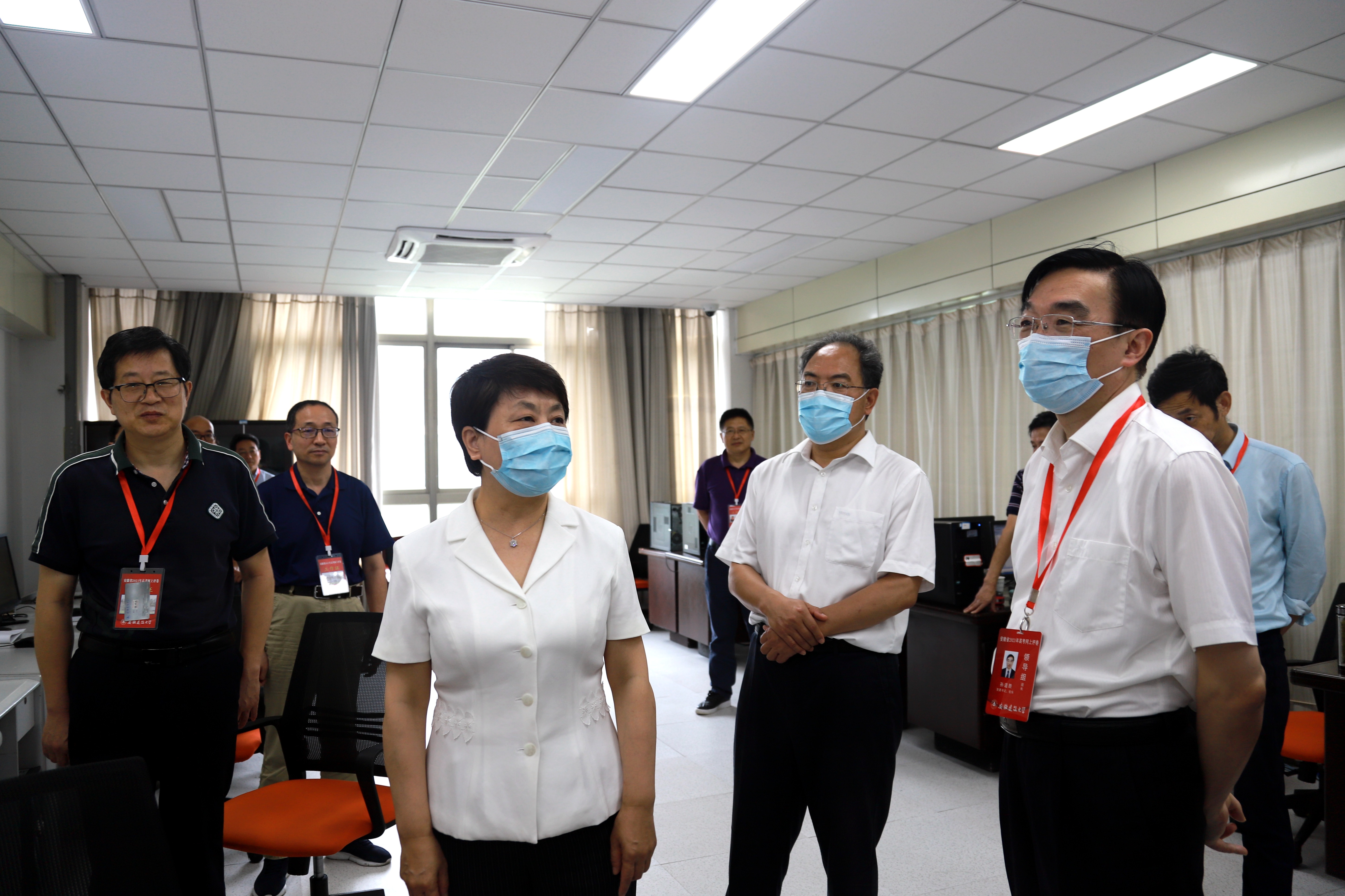 本网讯 6月15日上午,安徽省副省长王翠凤率队来校调研指导高考网上评卷工作,看望评卷工作人员。省政府副秘书长左俊,省委教育工委副书记、省教育厅厅长赵振华,省教育招生考试院副院长肖建荣,校领导孙道胜、吕萍、蔡新立陪同调研。