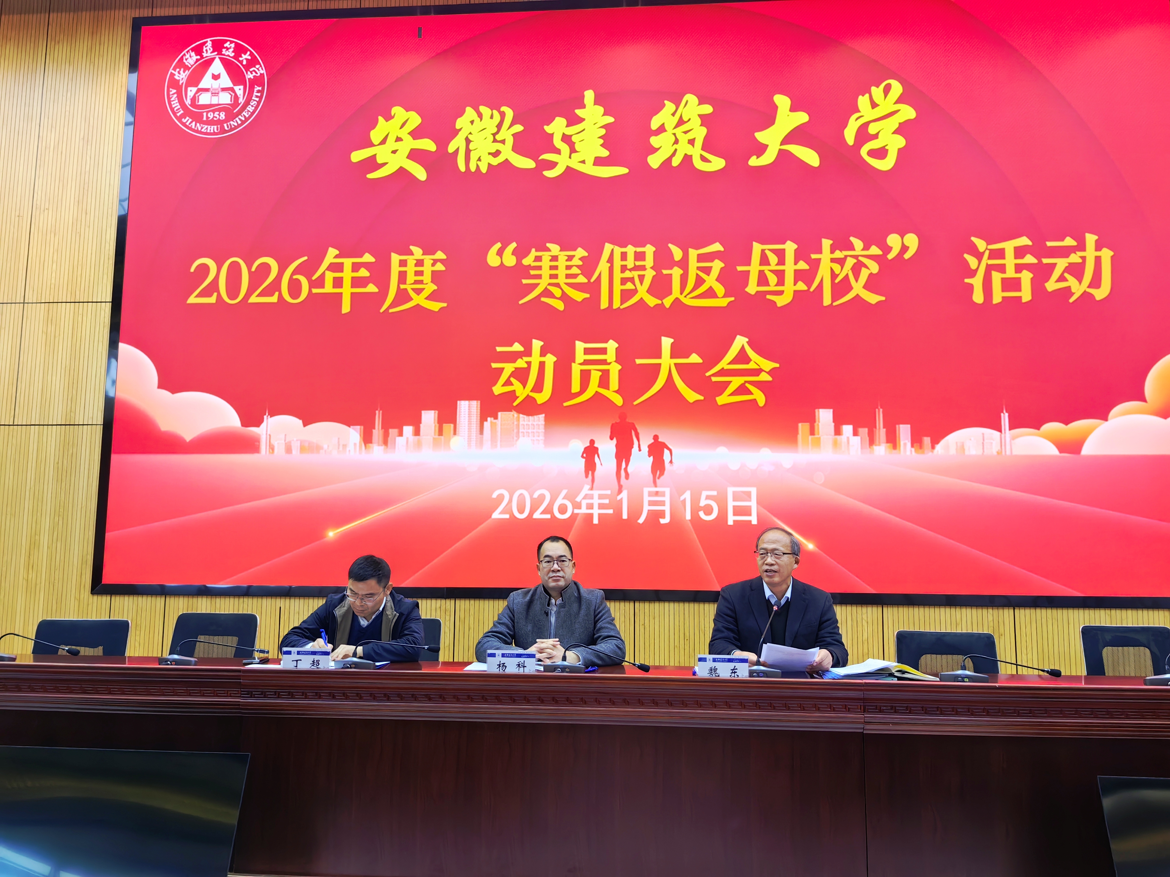 本网讯 1月15日,学校在紫云路校区徽韵楼二楼报告厅举行2026年度“寒假返母校”活动动员大会暨培训会,校党委常委、副校长杨科出席会议,校团委和各招生学院分管招生宣传工作负责人、2026年度“寒假返母校”报名志愿者代表参会,招生就业处处长魏东主持会议。